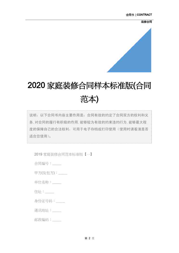 本站正式发布了《2020家庭装修合同样本标准版(合同范本)》文档,文档详细内容可下载阅读。 声明:本站所有文章,如无特殊说明或标注,均为本站原创发布。任何个人或组织,在未征得本站同意时,禁止复制、盗用、采集、发布本站内容到任何网站、书籍等各类媒体平台。如若本站内容侵犯了原著者的合法权益,可联系我们进行处理。