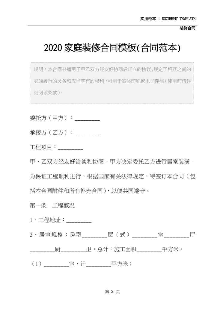 不久前,最新文档《2020家庭装修合同模板(合同范本)》全文正式在本站发布,感兴趣的用户可以下载阅读。 声明:本站所有文章,如无特殊说明或标注,均为本站原创发布。任何个人或组织,在未征得本站同意时,禁止复制、盗用、采集、发布本站内容到任何网站、书籍等各类媒体平台。如若本站内容侵犯了原著者的合法权益,可联系我们进行处理。