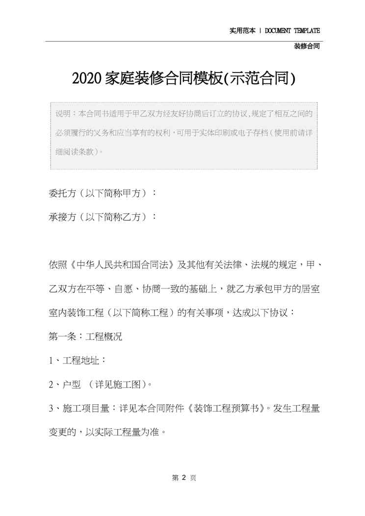 本站资深用户发布了最新的《2020家庭装修合同模板(示范合同)》文档,以下内容为预览,详细内容可下载阅读。 声明:本站所有文章,如无特殊说明或标注,均为本站原创发布。任何个人或组织,在未征得本站同意时,禁止复制、盗用、采集、发布本站内容到任何网站、书籍等各类媒体平台。如若本站内容侵犯了原著者的合法权益,可联系我们进行处理。
