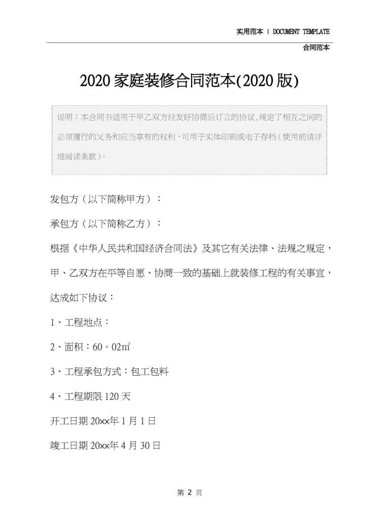 本站资深用户发布了最新的《2020家庭装修合同范本(2020版)》文档,以下内容为预览,详细内容可下载阅读。 声明:本站所有文章,如无特殊说明或标注,均为本站原创发布。任何个人或组织,在未征得本站同意时,禁止复制、盗用、采集、发布本站内容到任何网站、书籍等各类媒体平台。如若本站内容侵犯了原著者的合法权益,可联系我们进行处理。
