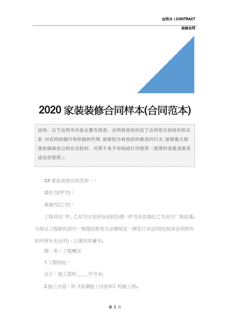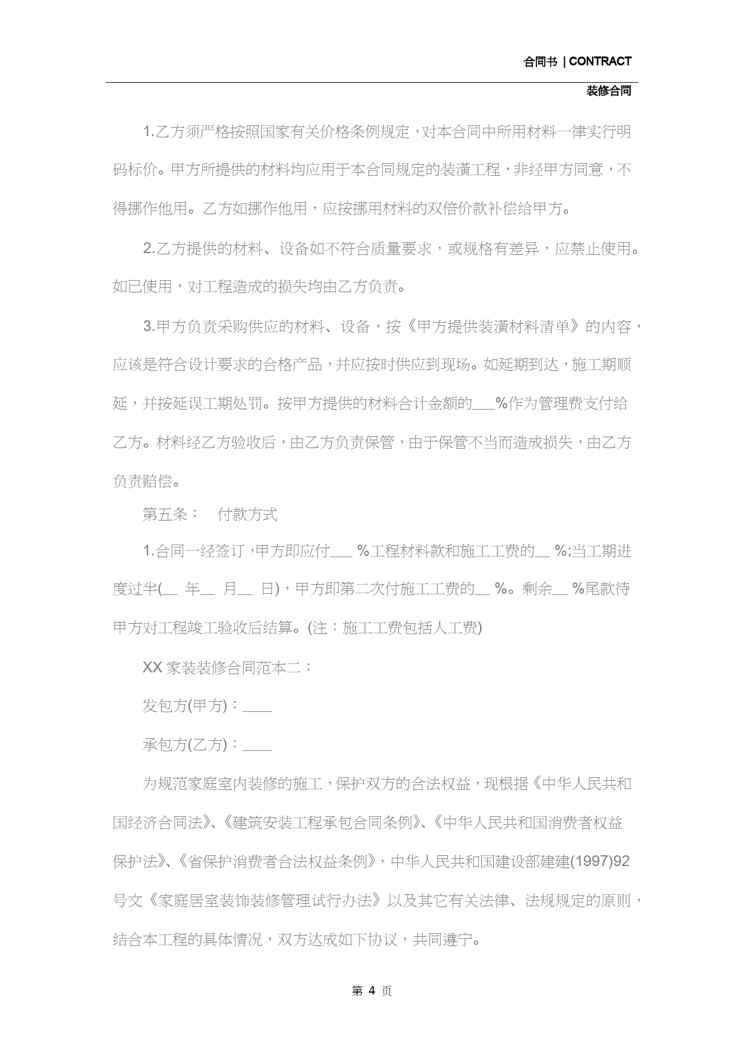 本站资深用户发布了最新的《2020家装装修合同样本(合同范本)》文档,以下内容为预览,详细内容可下载阅读。 声明:本站所有文章,如无特殊说明或标注,均为本站原创发布。任何个人或组织,在未征得本站同意时,禁止复制、盗用、采集、发布本站内容到任何网站、书籍等各类媒体平台。如若本站内容侵犯了原著者的合法权益,可联系我们进行处理。