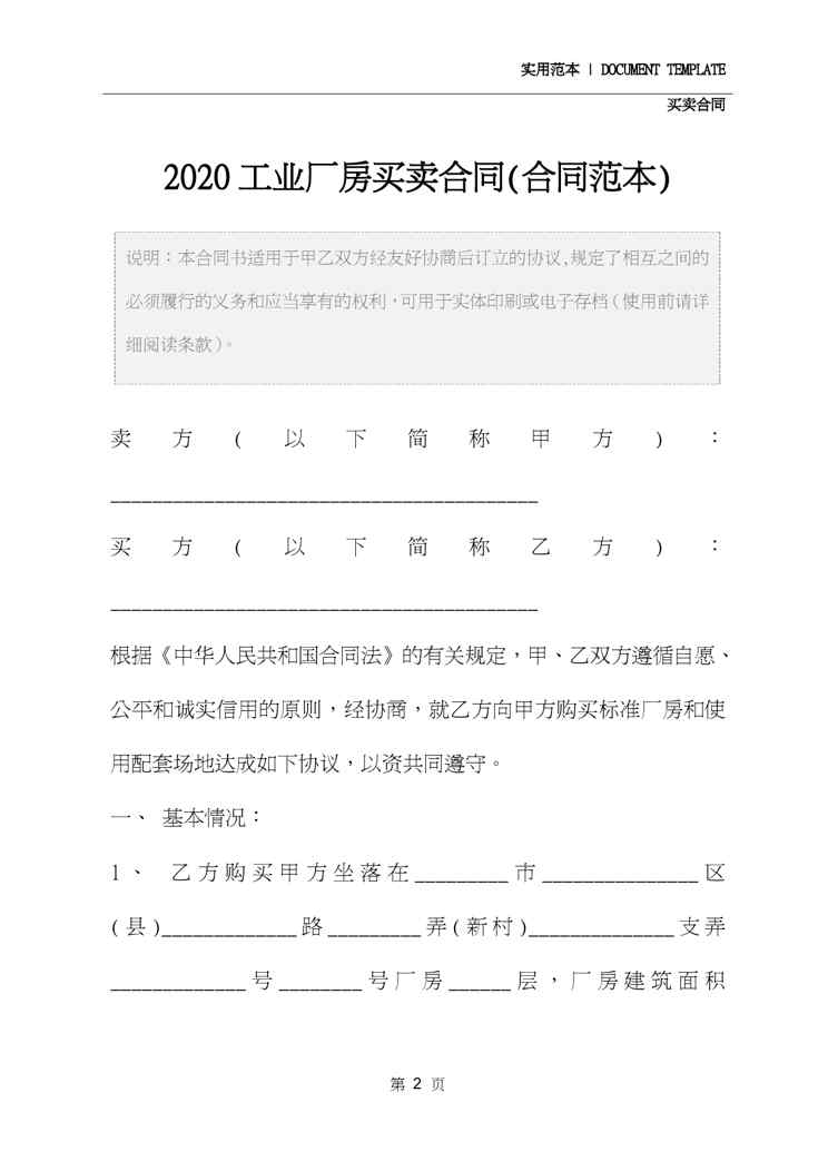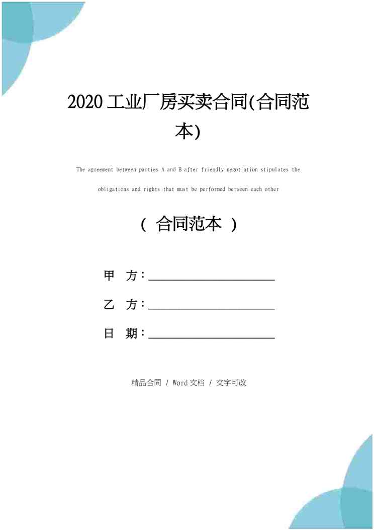本站正式发布了《2020工业厂房买卖合同(合同范本)》文档,文档详细内容可下载阅读。 声明:本站所有文章,如无特殊说明或标注,均为本站原创发布。任何个人或组织,在未征得本站同意时,禁止复制、盗用、采集、发布本站内容到任何网站、书籍等各类媒体平台。如若本站内容侵犯了原著者的合法权益,可联系我们进行处理。