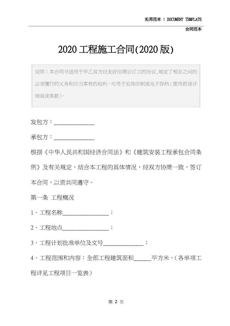 不久前,最新文档《2020工程施工合同(2020版)》全文正式在本站发布,感兴趣的用户可以下载阅读。 声明:本站所有文章,如无特殊说明或标注,均为本站原创发布。任何个人或组织,在未征得本站同意时,禁止复制、盗用、采集、发布本站内容到任何网站、书籍等各类媒体平台。如若本站内容侵犯了原著者的合法权益,可联系我们进行处理。