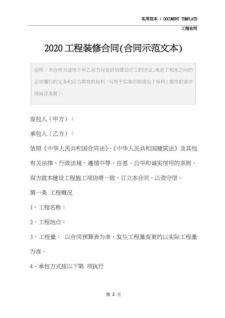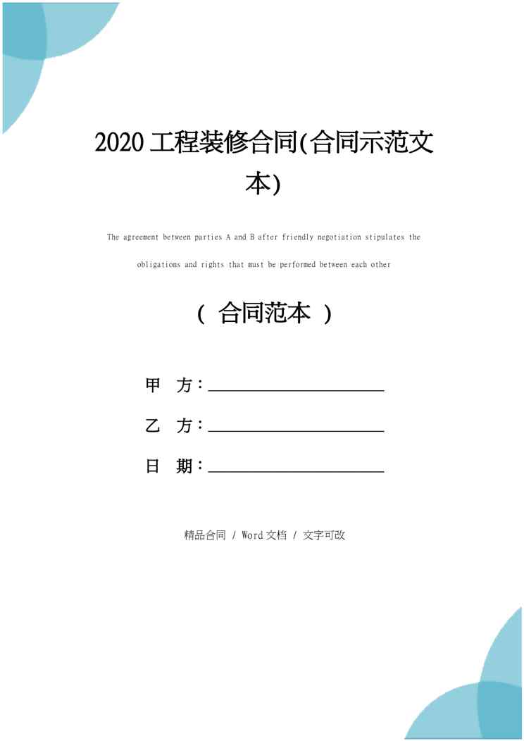 本站资深用户发布了最新的《2020工程装修合同(合同示范文本)》文档,以下内容为预览,详细内容可下载阅读。 声明:本站所有文章,如无特殊说明或标注,均为本站原创发布。任何个人或组织,在未征得本站同意时,禁止复制、盗用、采集、发布本站内容到任何网站、书籍等各类媒体平台。如若本站内容侵犯了原著者的合法权益,可联系我们进行处理。