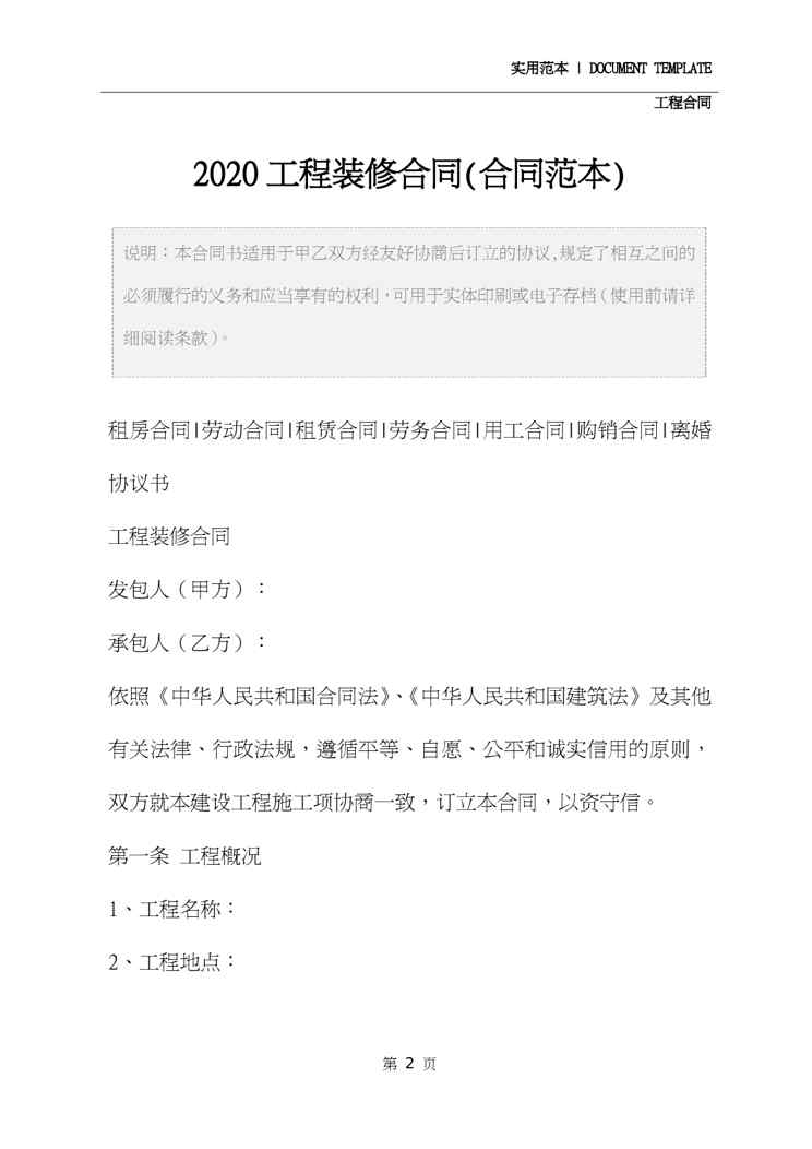 不久前,最新文档《2020工程装修合同(合同范本)》全文正式在本站发布,感兴趣的用户可以下载阅读。 声明:本站所有文章,如无特殊说明或标注,均为本站原创发布。任何个人或组织,在未征得本站同意时,禁止复制、盗用、采集、发布本站内容到任何网站、书籍等各类媒体平台。如若本站内容侵犯了原著者的合法权益,可联系我们进行处理。