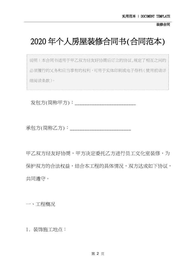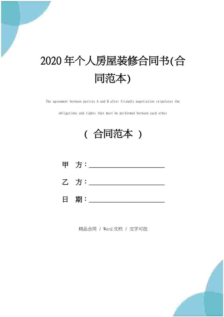 本站正式发布了《2020年个人房屋装修合同书(合同范本)》文档,文档详细内容可下载阅读。 声明:本站所有文章,如无特殊说明或标注,均为本站原创发布。任何个人或组织,在未征得本站同意时,禁止复制、盗用、采集、发布本站内容到任何网站、书籍等各类媒体平台。如若本站内容侵犯了原著者的合法权益,可联系我们进行处理。