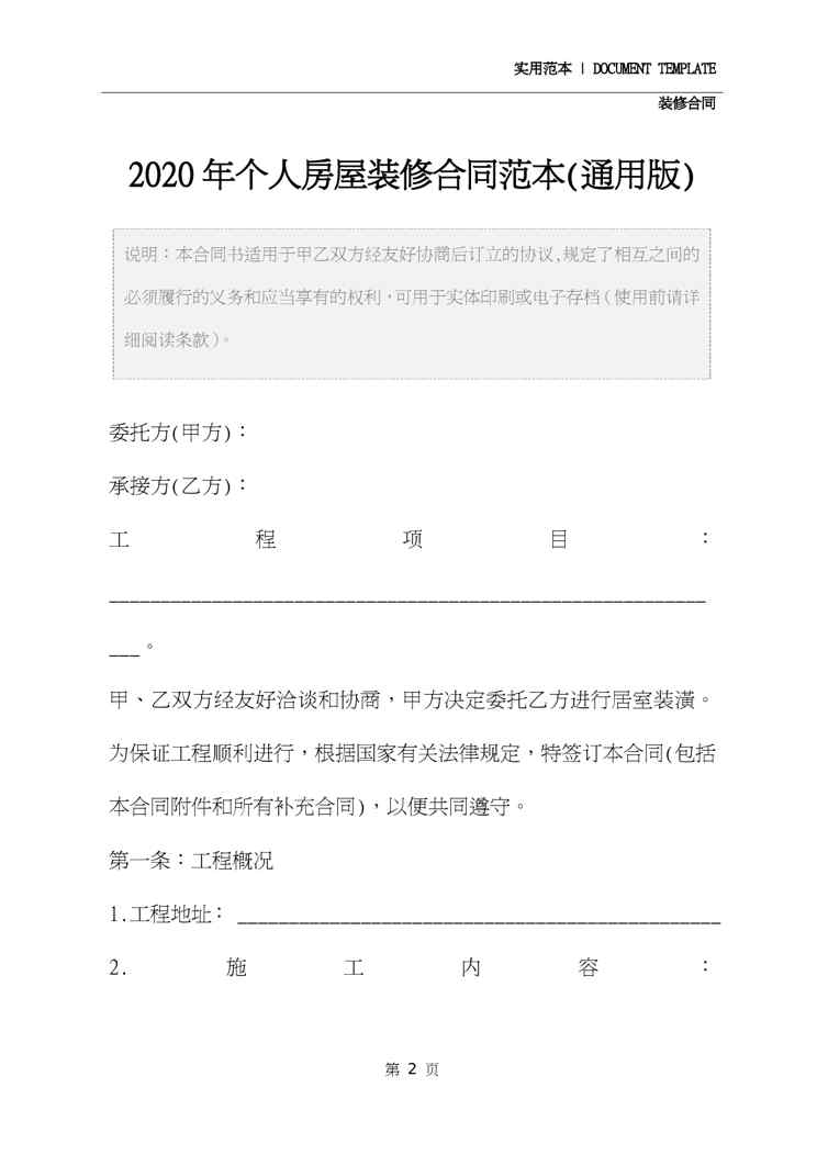 本站资深用户发布了最新的《2020年个人房屋装修合同范本(通用版)》文档,以下内容为预览,详细内容可下载阅读。 声明:本站所有文章,如无特殊说明或标注,均为本站原创发布。任何个人或组织,在未征得本站同意时,禁止复制、盗用、采集、发布本站内容到任何网站、书籍等各类媒体平台。如若本站内容侵犯了原著者的合法权益,可联系我们进行处理。