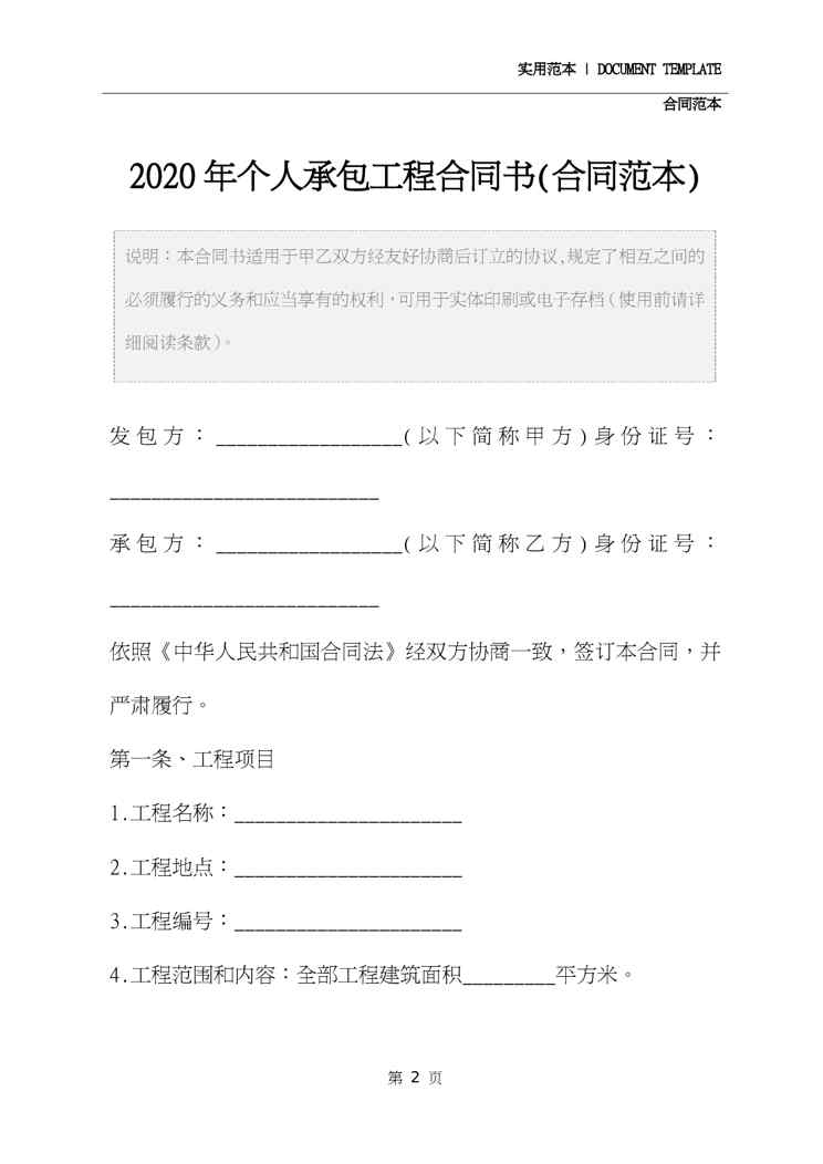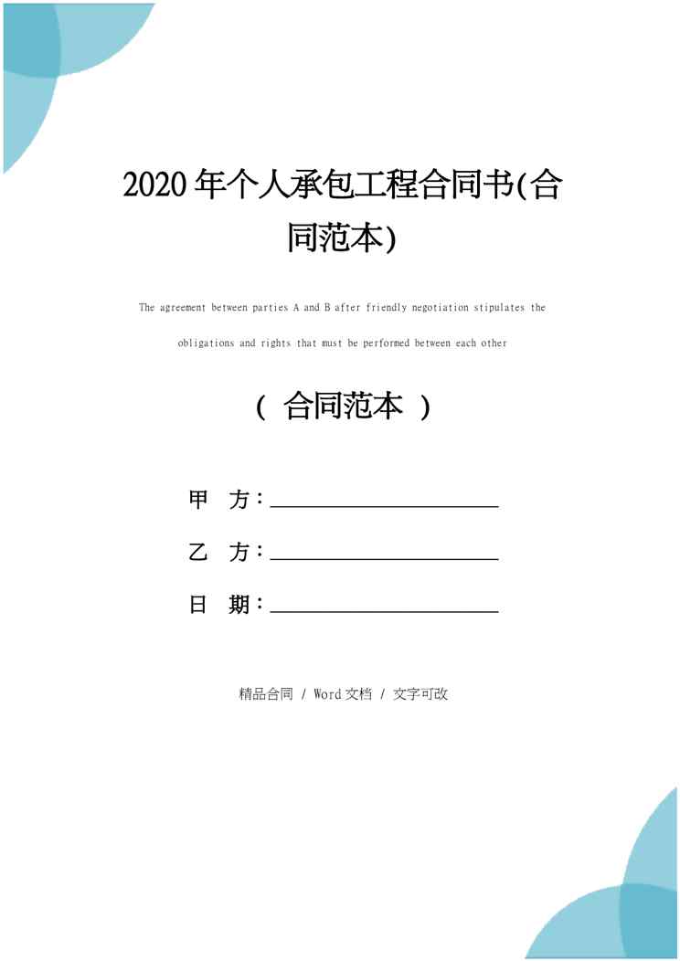 本站正式发布了《2020年个人承包工程合同书(合同范本)》文档,文档详细内容可下载阅读。 声明:本站所有文章,如无特殊说明或标注,均为本站原创发布。任何个人或组织,在未征得本站同意时,禁止复制、盗用、采集、发布本站内容到任何网站、书籍等各类媒体平台。如若本站内容侵犯了原著者的合法权益,可联系我们进行处理。