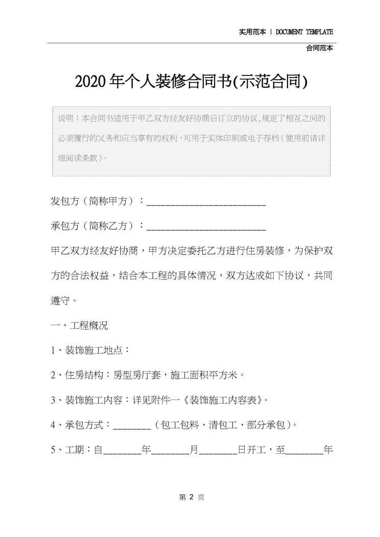 本站资深用户发布了最新的《2020年个人装修合同书(示范合同)》文档,以下内容为预览,详细内容可下载阅读。 声明:本站所有文章,如无特殊说明或标注,均为本站原创发布。任何个人或组织,在未征得本站同意时,禁止复制、盗用、采集、发布本站内容到任何网站、书籍等各类媒体平台。如若本站内容侵犯了原著者的合法权益,可联系我们进行处理。