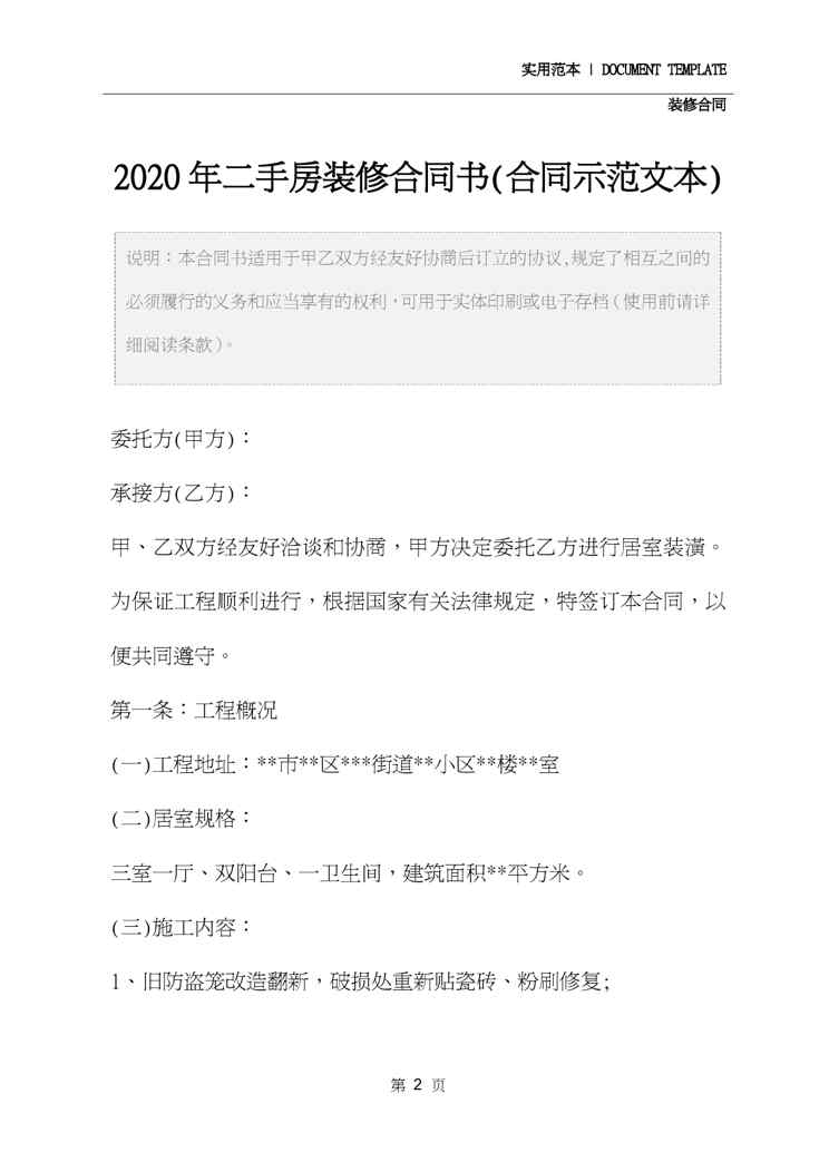 本站正式发布了《2020年二手房装修合同书(合同示范文本)》文档,文档详细内容可下载阅读。