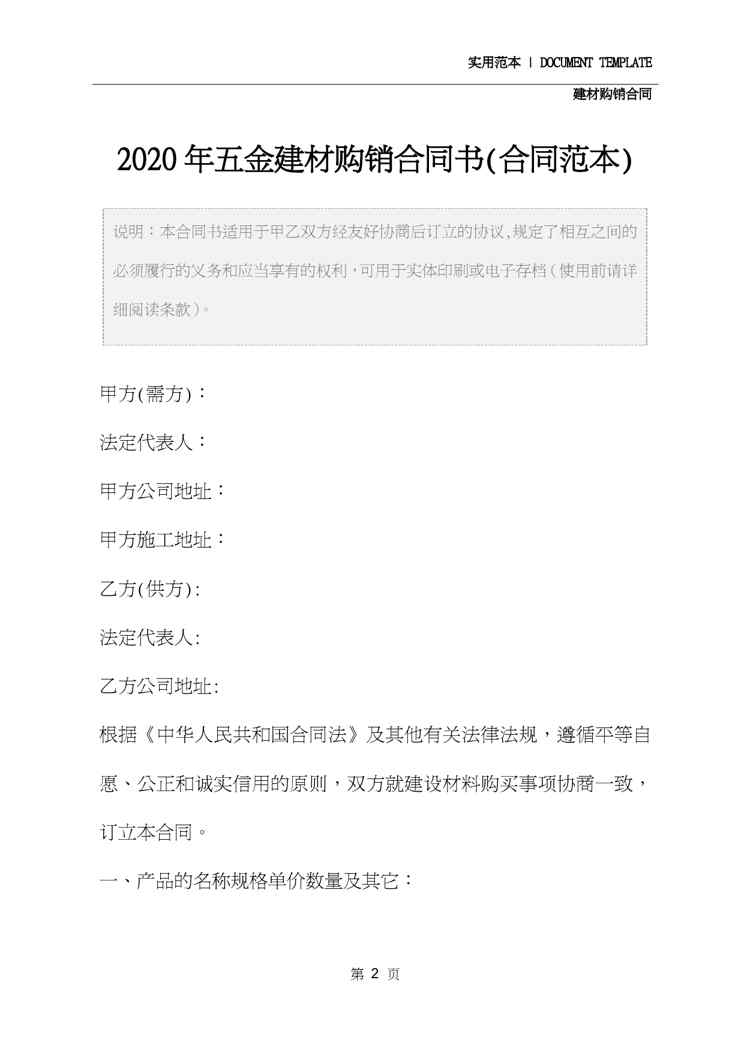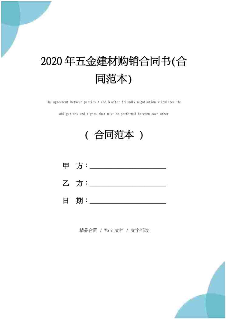 本站正式发布了《2020年五金建材购销合同书(合同范本)》文档,文档详细内容可下载阅读。 声明:本站所有文章,如无特殊说明或标注,均为本站原创发布。任何个人或组织,在未征得本站同意时,禁止复制、盗用、采集、发布本站内容到任何网站、书籍等各类媒体平台。如若本站内容侵犯了原著者的合法权益,可联系我们进行处理。