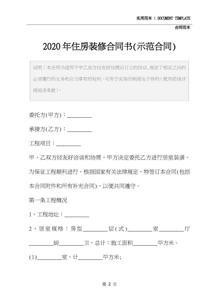 本站正式发布了《2020年住房装修合同书(示范合同)》文档,文档详细内容可下载阅读。 声明:本站所有文章,如无特殊说明或标注,均为本站原创发布。任何个人或组织,在未征得本站同意时,禁止复制、盗用、采集、发布本站内容到任何网站、书籍等各类媒体平台。如若本站内容侵犯了原著者的合法权益,可联系我们进行处理。