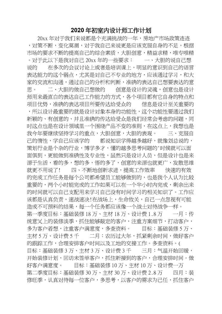 本站资深用户发布了最新的《2020年初室内设计师工作计划》文档,以下内容为预览,详细内容可下载阅读。 声明:本站所有文章,如无特殊说明或标注,均为本站原创发布。任何个人或组织,在未征得本站同意时,禁止复制、盗用、采集、发布本站内容到任何网站、书籍等各类媒体平台。如若本站内容侵犯了原著者的合法权益,可联系我们进行处理。