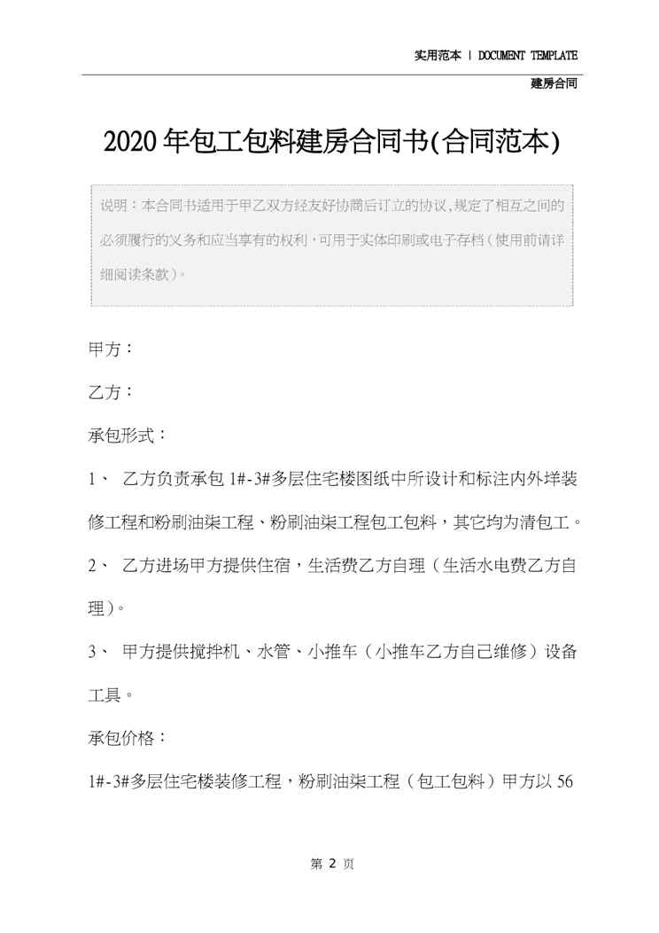 本站资深用户发布了最新的《2020年包工包料建房合同书(合同范本)》文档,以下内容为预览,详细内容可下载阅读。 声明:本站所有文章,如无特殊说明或标注,均为本站原创发布。任何个人或组织,在未征得本站同意时,禁止复制、盗用、采集、发布本站内容到任何网站、书籍等各类媒体平台。如若本站内容侵犯了原著者的合法权益,可联系我们进行处理。