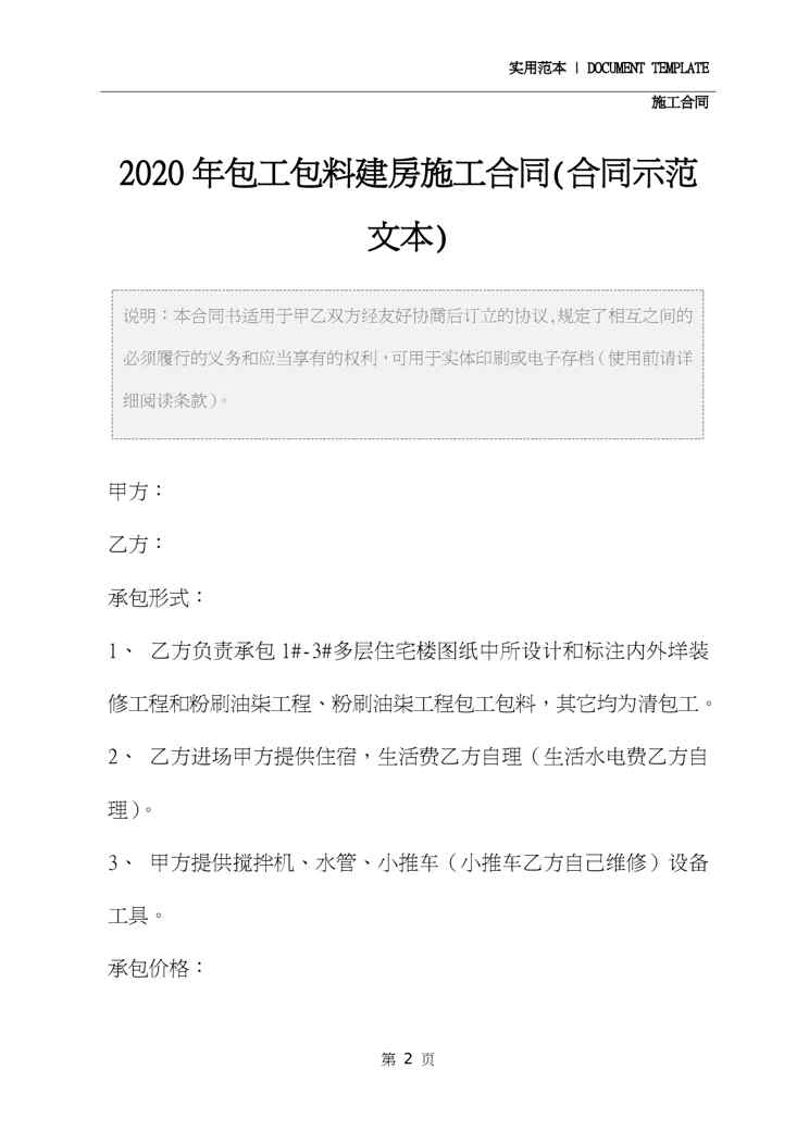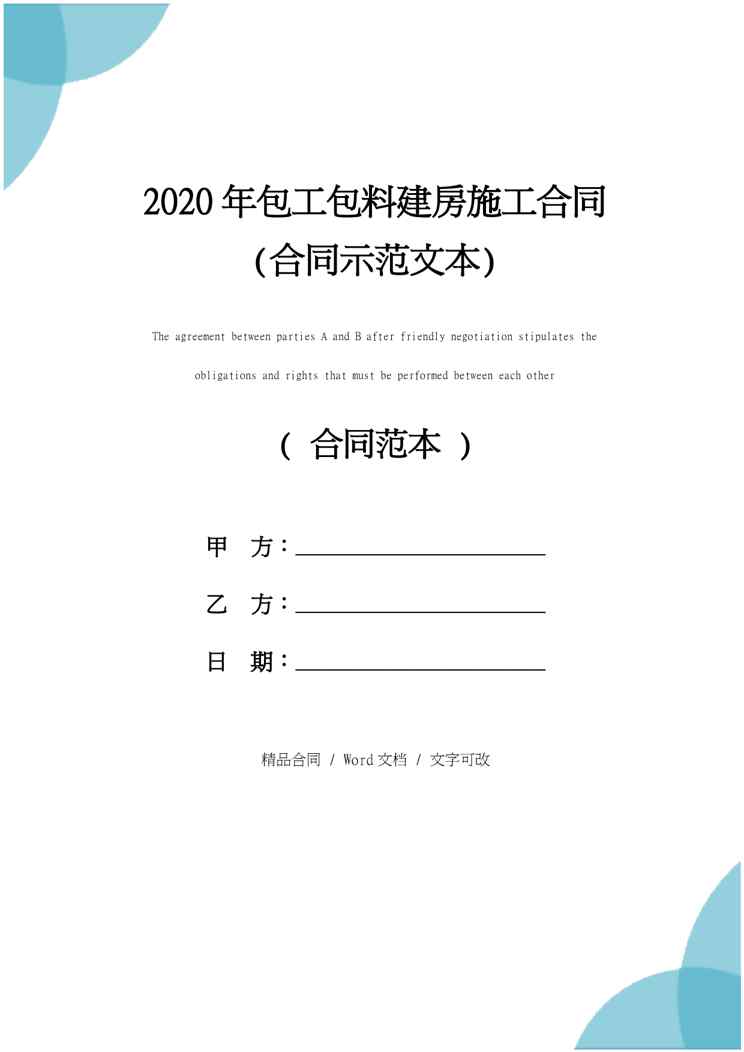 本站资深用户发布了最新的《2020年包工包料建房施工合同(合同示范文本)》文档,以下内容为预览,详细内容可下载阅读。 声明:本站所有文章,如无特殊说明或标注,均为本站原创发布。任何个人或组织,在未征得本站同意时,禁止复制、盗用、采集、发布本站内容到任何网站、书籍等各类媒体平台。如若本站内容侵犯了原著者的合法权益,可联系我们进行处理。