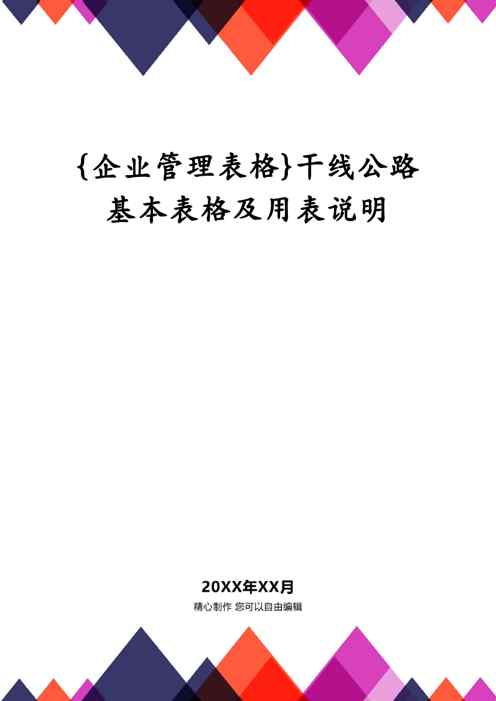 本站资深用户发布了最新的《{企业管理表格}干线公路基本表格及用表说明》文档,以下内容为预览,详细内容可下载阅读。 声明:本站所有文章,如无特殊说明或标注,均为本站原创发布。任何个人或组织,在未征得本站同意时,禁止复制、盗用、采集、发布本站内容到任何网站、书籍等各类媒体平台。如若本站内容侵犯了原著者的合法权益,可联系我们进行处理。