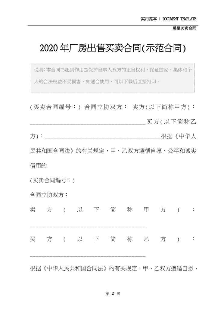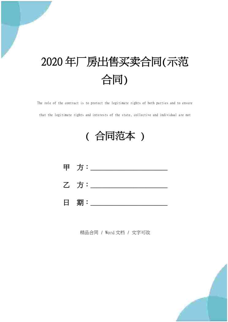 不久前,最新文档《2020年厂房出售买卖合同正式模版》全文正式在本站发布,感兴趣的用户可以下载阅读。 声明:本站所有文章,如无特殊说明或标注,均为本站原创发布。任何个人或组织,在未征得本站同意时,禁止复制、盗用、采集、发布本站内容到任何网站、书籍等各类媒体平台。如若本站内容侵犯了原著者的合法权益,可联系我们进行处理。