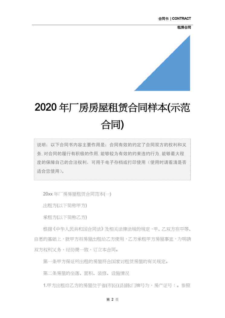 不久前,最新文档《2020年厂房房屋租赁合同样本(示范合同)》全文正式在本站发布,感兴趣的用户可以下载阅读。 声明:本站所有文章,如无特殊说明或标注,均为本站原创发布。任何个人或组织,在未征得本站同意时,禁止复制、盗用、采集、发布本站内容到任何网站、书籍等各类媒体平台。如若本站内容侵犯了原著者的合法权益,可联系我们进行处理。