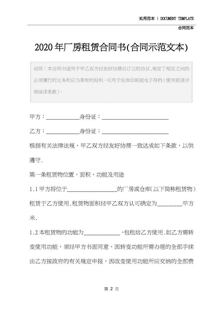 本站正式发布了《2020年厂房租赁合同书(合同示范文本)》文档,文档详细内容可下载阅读。 声明:本站所有文章,如无特殊说明或标注,均为本站原创发布。任何个人或组织,在未征得本站同意时,禁止复制、盗用、采集、发布本站内容到任何网站、书籍等各类媒体平台。如若本站内容侵犯了原著者的合法权益,可联系我们进行处理。