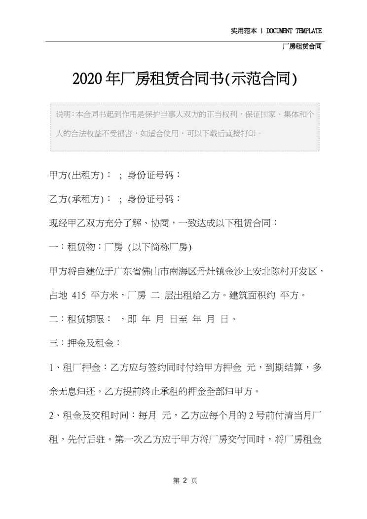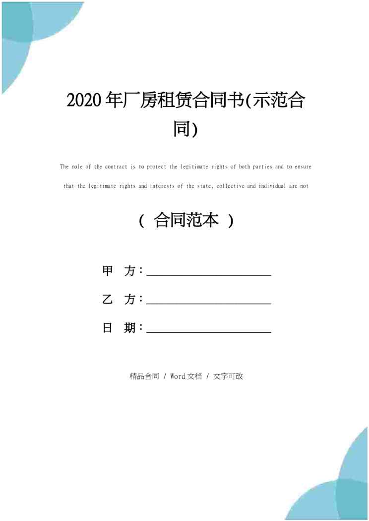 本站正式发布了《2020年厂房租赁合同书通用版》文档,文档详细内容可下载阅读。 声明:本站所有文章,如无特殊说明或标注,均为本站原创发布。任何个人或组织,在未征得本站同意时,禁止复制、盗用、采集、发布本站内容到任何网站、书籍等各类媒体平台。如若本站内容侵犯了原著者的合法权益,可联系我们进行处理。