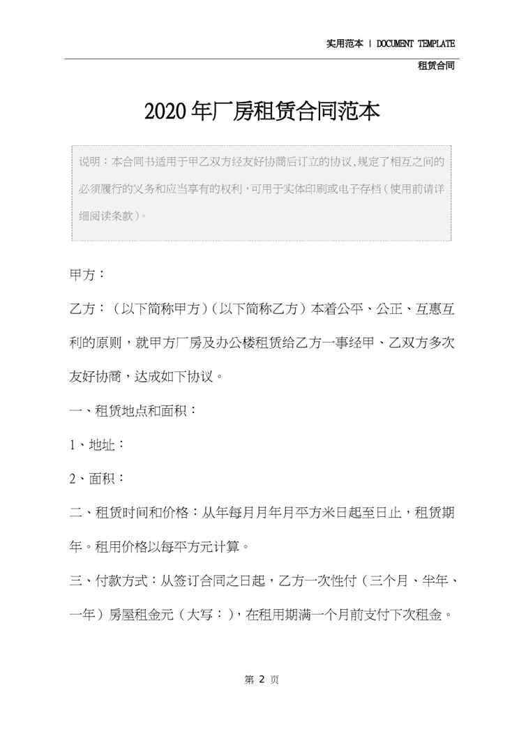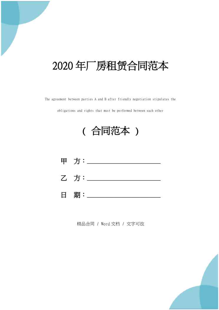 本站正式发布了《2020年厂房租赁合同范本》文档,文档详细内容可下载阅读。 声明:本站所有文章,如无特殊说明或标注,均为本站原创发布。任何个人或组织,在未征得本站同意时,禁止复制、盗用、采集、发布本站内容到任何网站、书籍等各类媒体平台。如若本站内容侵犯了原著者的合法权益,可联系我们进行处理。