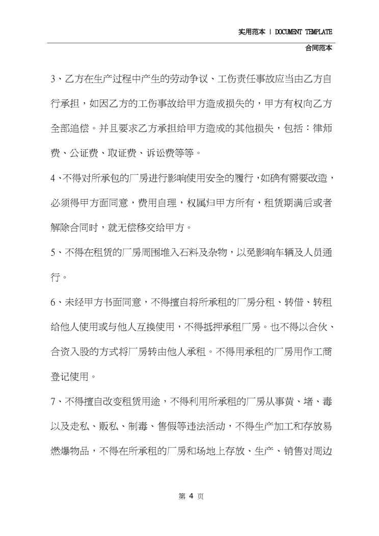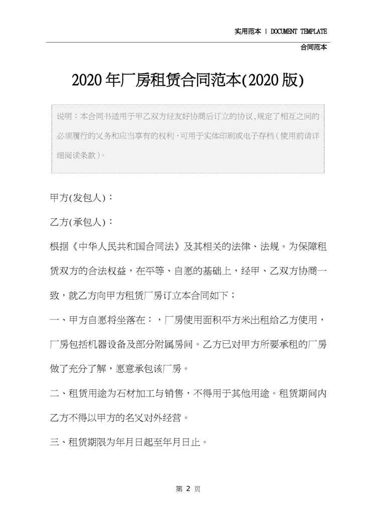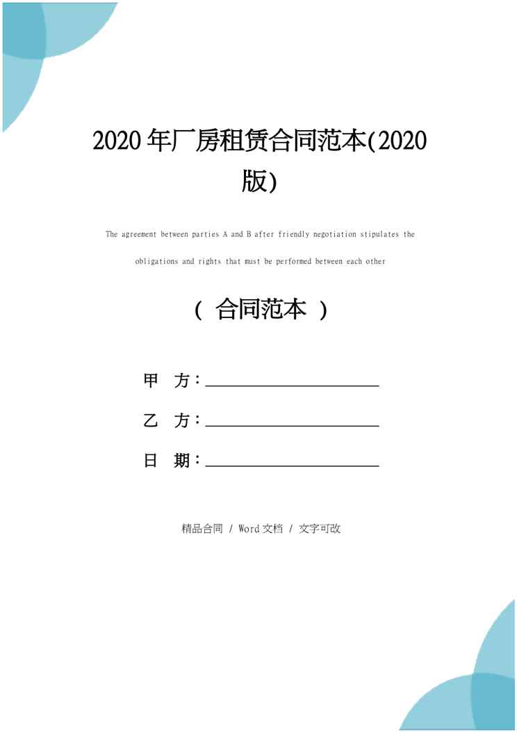 本站资深用户发布了最新的《2020年厂房租赁合同范本(2020版)》文档,以下内容为预览,详细内容可下载阅读。 声明:本站所有文章,如无特殊说明或标注,均为本站原创发布。任何个人或组织,在未征得本站同意时,禁止复制、盗用、采集、发布本站内容到任何网站、书籍等各类媒体平台。如若本站内容侵犯了原著者的合法权益,可联系我们进行处理。