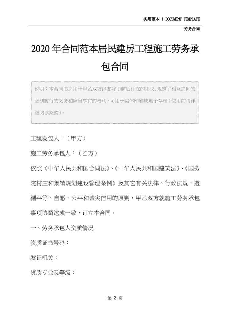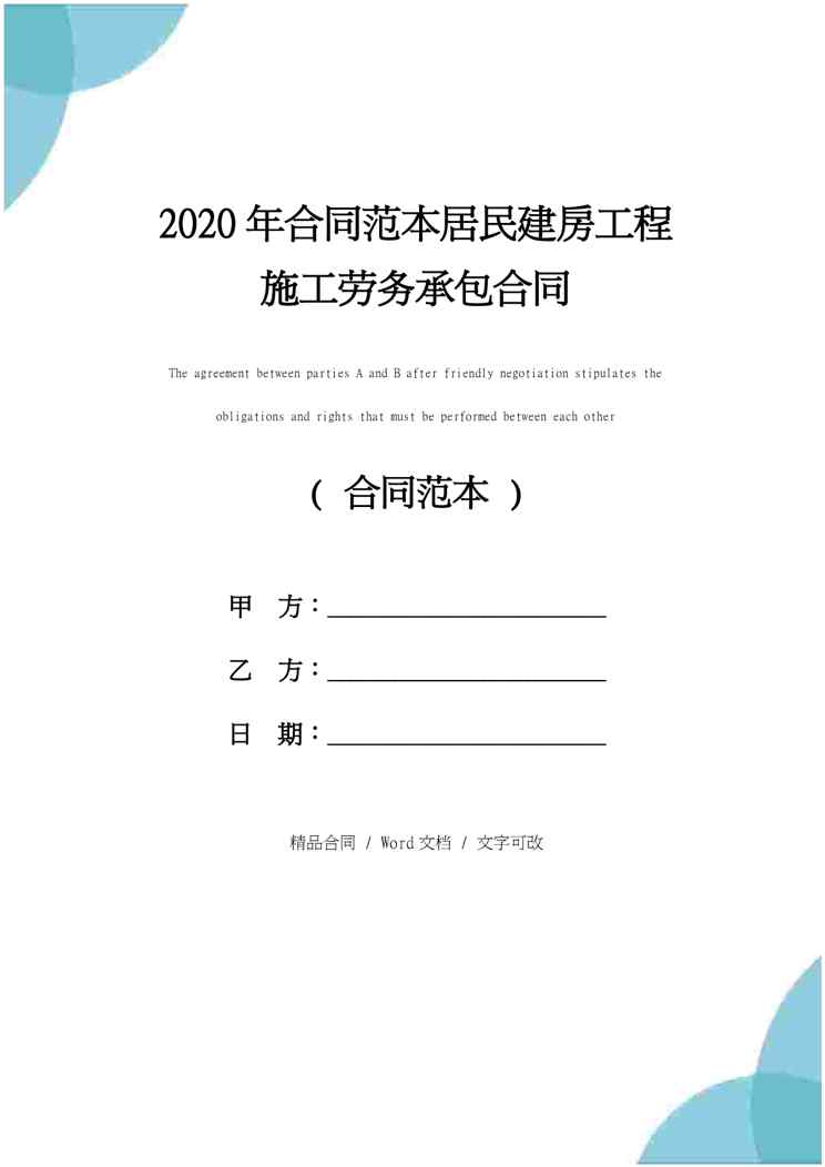 本站正式发布了《2020年合同范本居民建房工程施工劳务承包合同》文档,文档详细内容可下载阅读。 声明:本站所有文章,如无特殊说明或标注,均为本站原创发布。任何个人或组织,在未征得本站同意时,禁止复制、盗用、采集、发布本站内容到任何网站、书籍等各类媒体平台。如若本站内容侵犯了原著者的合法权益,可联系我们进行处理。