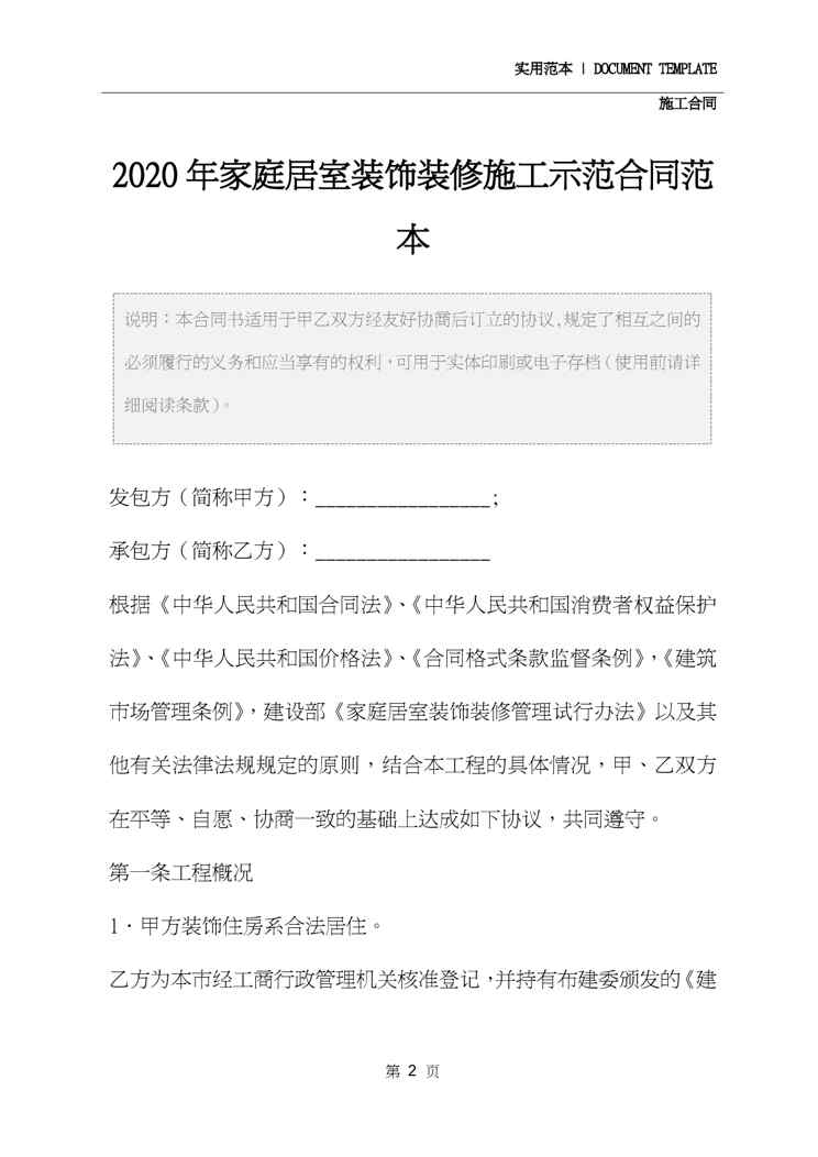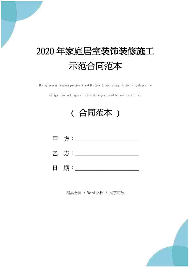 本站正式发布了《2020年家庭居室装饰装修施工示范合同范本》文档,文档详细内容可下载阅读。 声明:本站所有文章,如无特殊说明或标注,均为本站原创发布。任何个人或组织,在未征得本站同意时,禁止复制、盗用、采集、发布本站内容到任何网站、书籍等各类媒体平台。如若本站内容侵犯了原著者的合法权益,可联系我们进行处理。