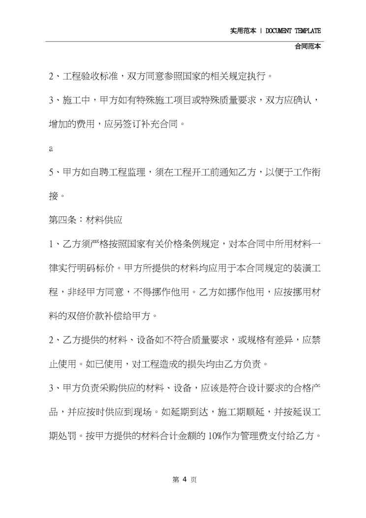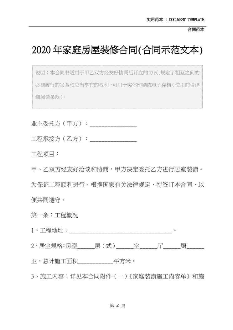 本站资深用户发布了最新的《2020年家庭房屋装修合同(合同示范文本)》文档,以下内容为预览,详细内容可下载阅读。 声明:本站所有文章,如无特殊说明或标注,均为本站原创发布。任何个人或组织,在未征得本站同意时,禁止复制、盗用、采集、发布本站内容到任何网站、书籍等各类媒体平台。如若本站内容侵犯了原著者的合法权益,可联系我们进行处理。