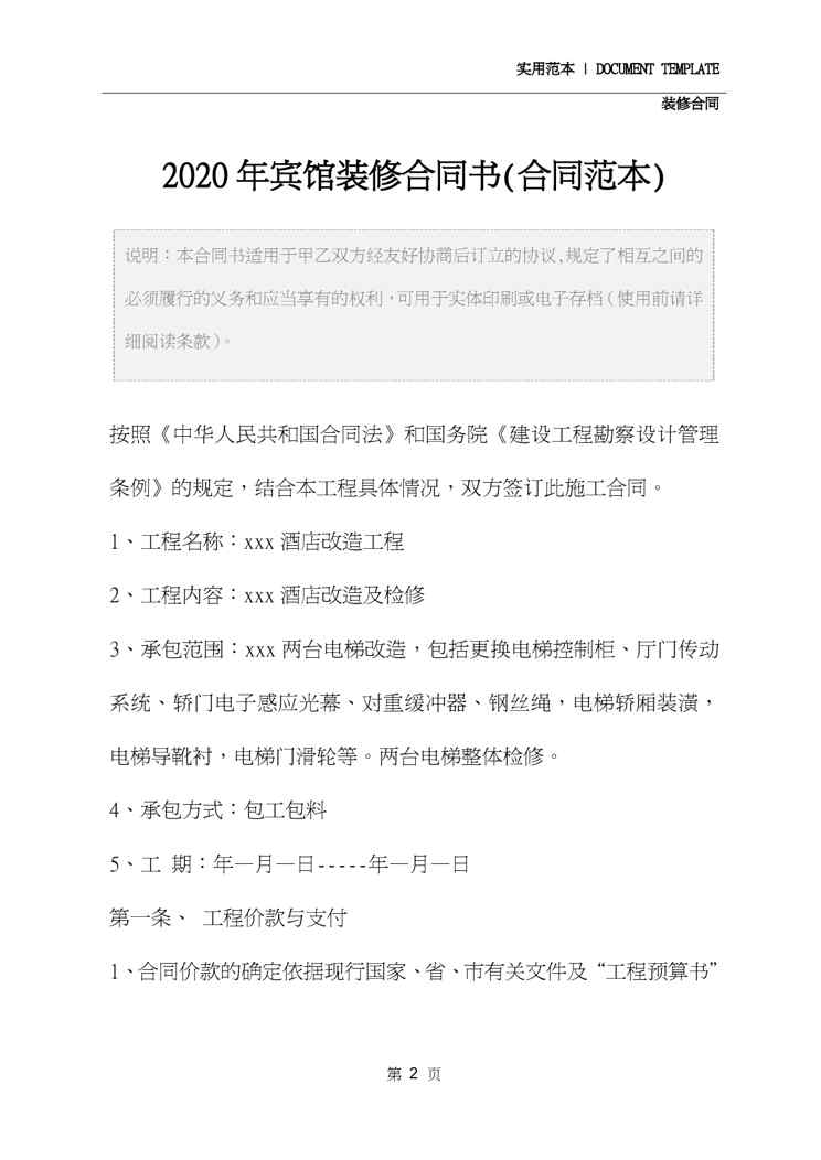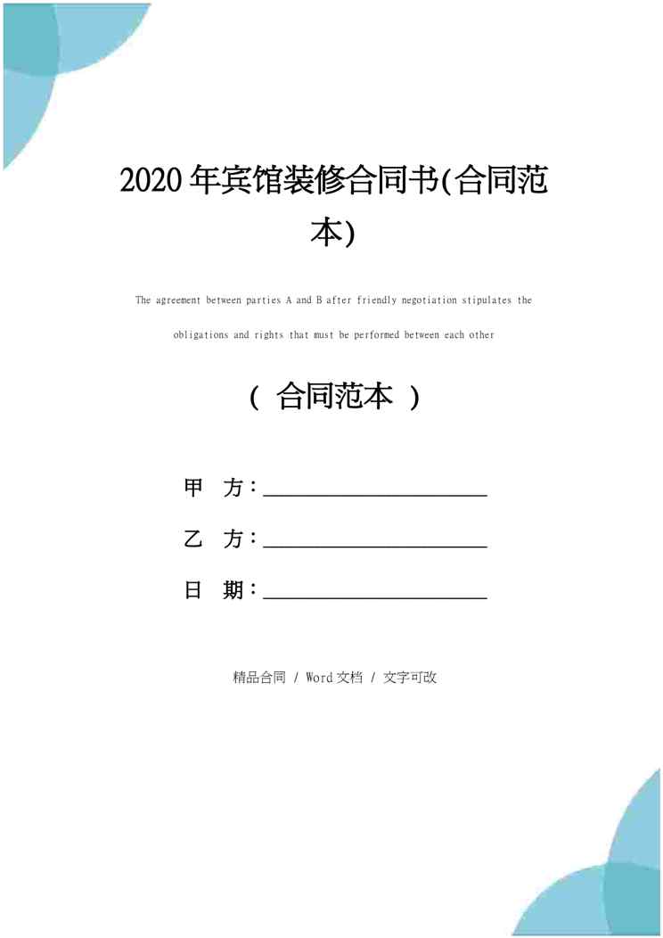 不久前,最新文档《2020年宾馆装修合同书(合同范本)》全文正式在本站发布,感兴趣的用户可以下载阅读。 声明:本站所有文章,如无特殊说明或标注,均为本站原创发布。任何个人或组织,在未征得本站同意时,禁止复制、盗用、采集、发布本站内容到任何网站、书籍等各类媒体平台。如若本站内容侵犯了原著者的合法权益,可联系我们进行处理。