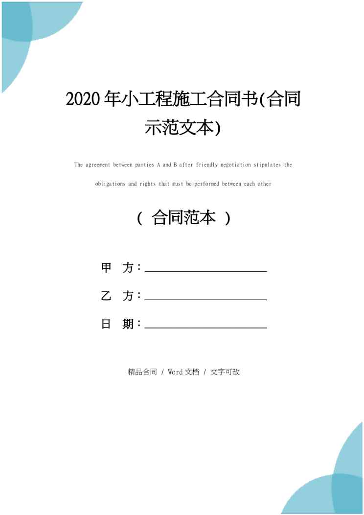 本站正式发布了《2020年小工程施工合同书(合同示范文本)》文档,文档详细内容可下载阅读。 声明:本站所有文章,如无特殊说明或标注,均为本站原创发布。任何个人或组织,在未征得本站同意时,禁止复制、盗用、采集、发布本站内容到任何网站、书籍等各类媒体平台。如若本站内容侵犯了原著者的合法权益,可联系我们进行处理。