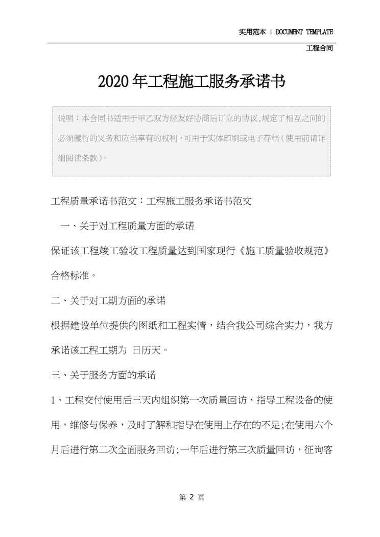 本站资深用户发布了最新的《2020年工程施工服务承诺书》文档,以下内容为预览,详细内容可下载阅读。 声明:本站所有文章,如无特殊说明或标注,均为本站原创发布。任何个人或组织,在未征得本站同意时,禁止复制、盗用、采集、发布本站内容到任何网站、书籍等各类媒体平台。如若本站内容侵犯了原著者的合法权益,可联系我们进行处理。