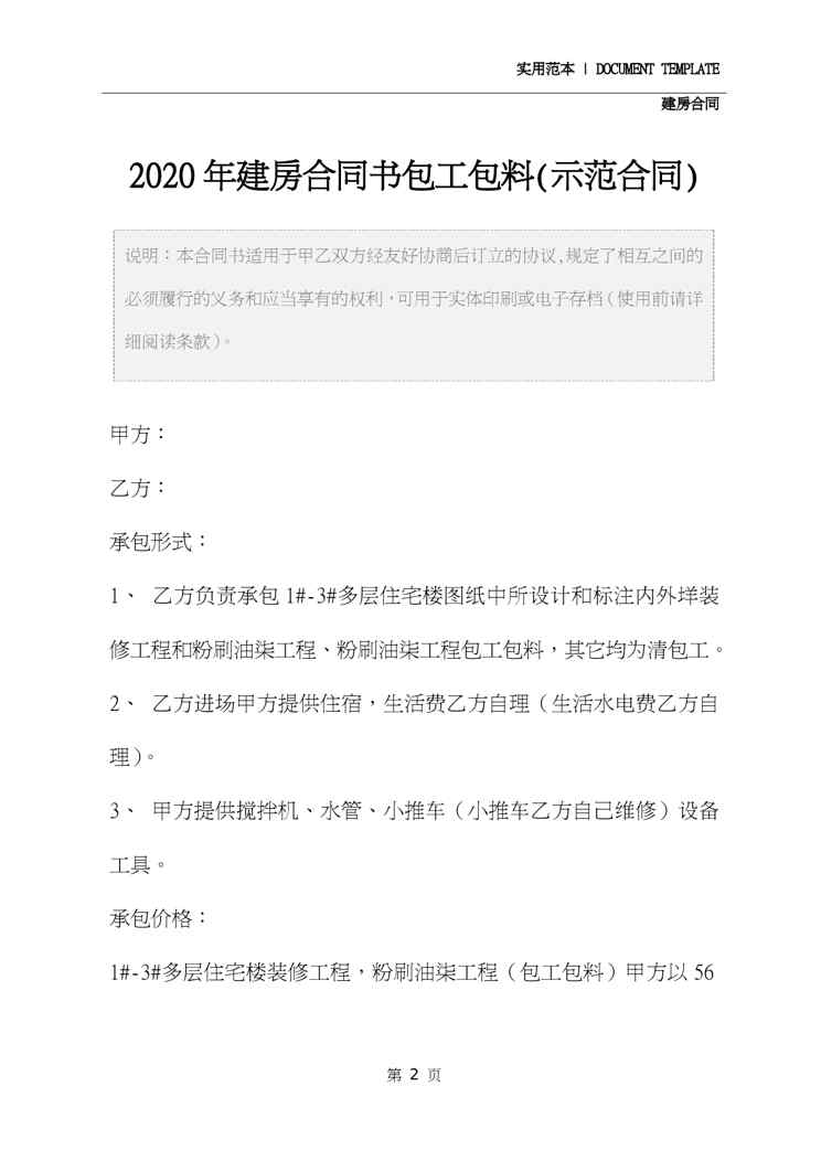 本站正式发布了《2020年建房合同书包工包料(示范合同)》文档,文档详细内容可下载阅读。 声明:本站所有文章,如无特殊说明或标注,均为本站原创发布。任何个人或组织,在未征得本站同意时,禁止复制、盗用、采集、发布本站内容到任何网站、书籍等各类媒体平台。如若本站内容侵犯了原著者的合法权益,可联系我们进行处理。