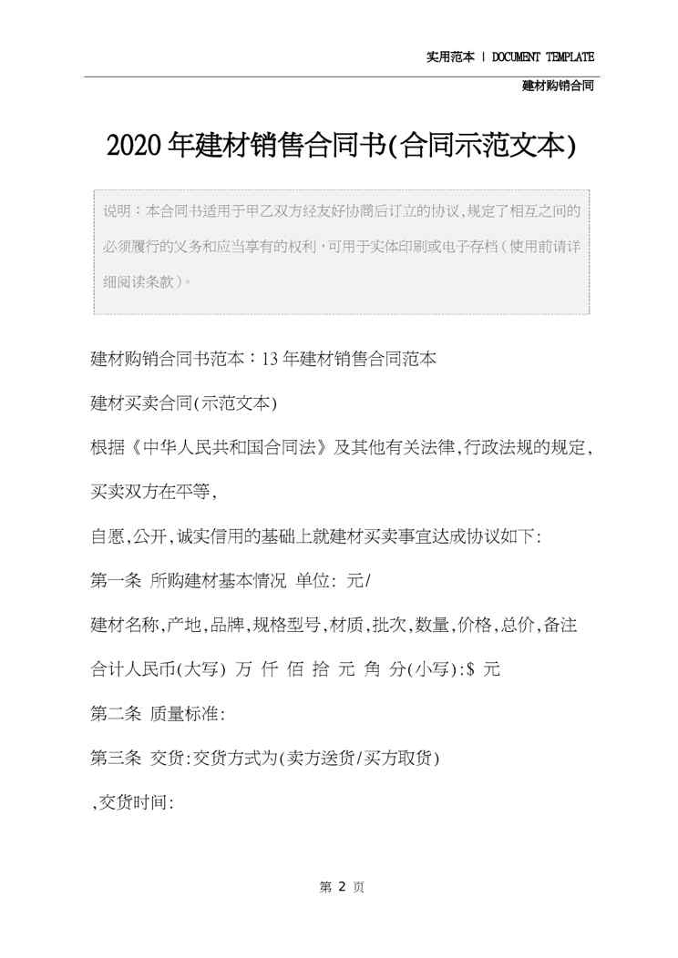 本站正式发布了《2020年建材销售合同书(合同示范文本)》文档,文档详细内容可下载阅读。 声明:本站所有文章,如无特殊说明或标注,均为本站原创发布。任何个人或组织,在未征得本站同意时,禁止复制、盗用、采集、发布本站内容到任何网站、书籍等各类媒体平台。如若本站内容侵犯了原著者的合法权益,可联系我们进行处理。