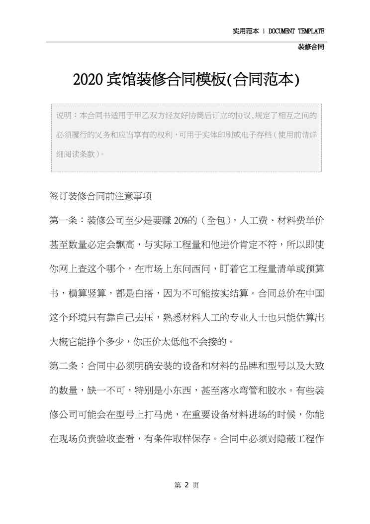 不久前,最新文档《2020宾馆装修合同模板(合同范本)》全文正式在本站发布,感兴趣的用户可以下载阅读。 声明:本站所有文章,如无特殊说明或标注,均为本站原创发布。任何个人或组织,在未征得本站同意时,禁止复制、盗用、采集、发布本站内容到任何网站、书籍等各类媒体平台。如若本站内容侵犯了原著者的合法权益,可联系我们进行处理。