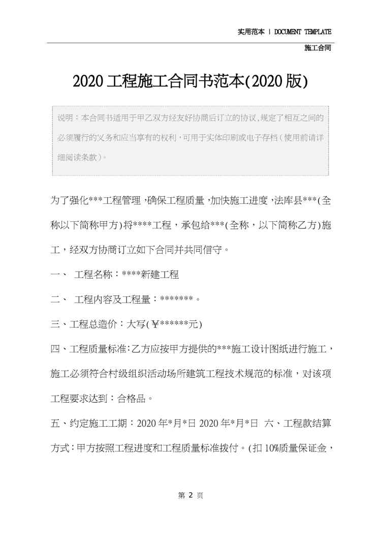 本站正式发布了《2020工程施工合同书范本(2020版)》文档,文档详细内容可下载阅读。 声明:本站所有文章,如无特殊说明或标注,均为本站原创发布。任何个人或组织,在未征得本站同意时,禁止复制、盗用、采集、发布本站内容到任何网站、书籍等各类媒体平台。如若本站内容侵犯了原著者的合法权益,可联系我们进行处理。