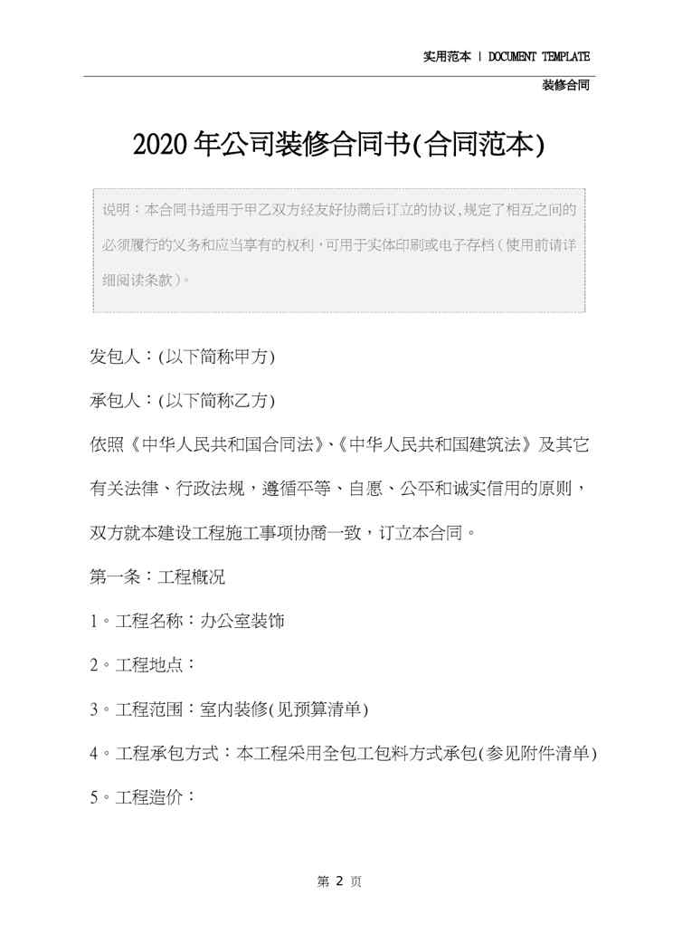 不久前,最新文档《2020年公司装修合同书(合同范本)》全文正式在本站发布,感兴趣的用户可以下载阅读。 声明:本站所有文章,如无特殊说明或标注,均为本站原创发布。任何个人或组织,在未征得本站同意时,禁止复制、盗用、采集、发布本站内容到任何网站、书籍等各类媒体平台。如若本站内容侵犯了原著者的合法权益,可联系我们进行处理。
