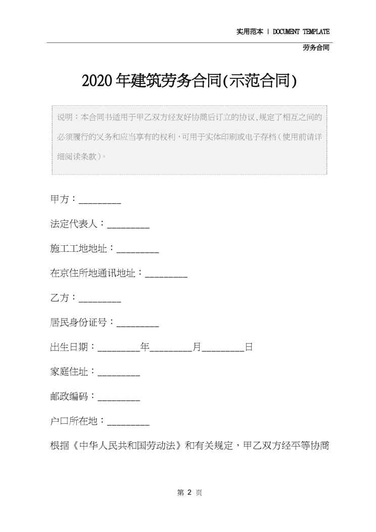 本站正式发布了《2020年建筑劳务合同(示范合同)》文档,文档详细内容可下载阅读。 声明:本站所有文章,如无特殊说明或标注,均为本站原创发布。任何个人或组织,在未征得本站同意时,禁止复制、盗用、采集、发布本站内容到任何网站、书籍等各类媒体平台。如若本站内容侵犯了原著者的合法权益,可联系我们进行处理。
