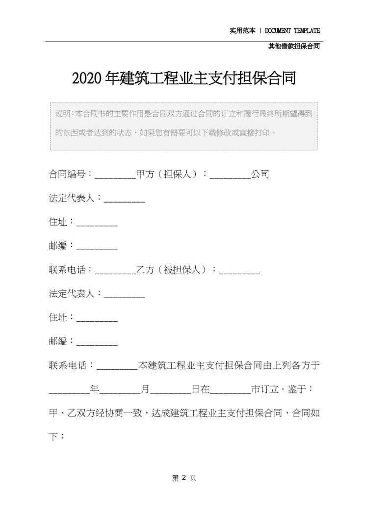 本站正式发布了《2020年建筑工程业主支付担保合同》文档,文档详细内容可下载阅读。 声明:本站所有文章,如无特殊说明或标注,均为本站原创发布。任何个人或组织,在未征得本站同意时,禁止复制、盗用、采集、发布本站内容到任何网站、书籍等各类媒体平台。如若本站内容侵犯了原著者的合法权益,可联系我们进行处理。