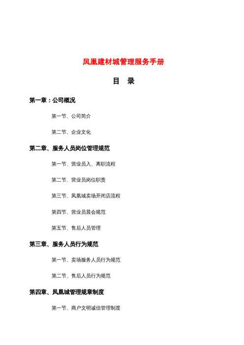 不久前,最新文档《{企业管理手册}凤凰建材城管理服务手册》全文正式在本站发布,感兴趣的用户可以下载阅读。 声明:本站所有文章,如无特殊说明或标注,均为本站原创发布。任何个人或组织,在未征得本站同意时,禁止复制、盗用、采集、发布本站内容到任何网站、书籍等各类媒体平台。如若本站内容侵犯了原著者的合法权益,可联系我们进行处理。