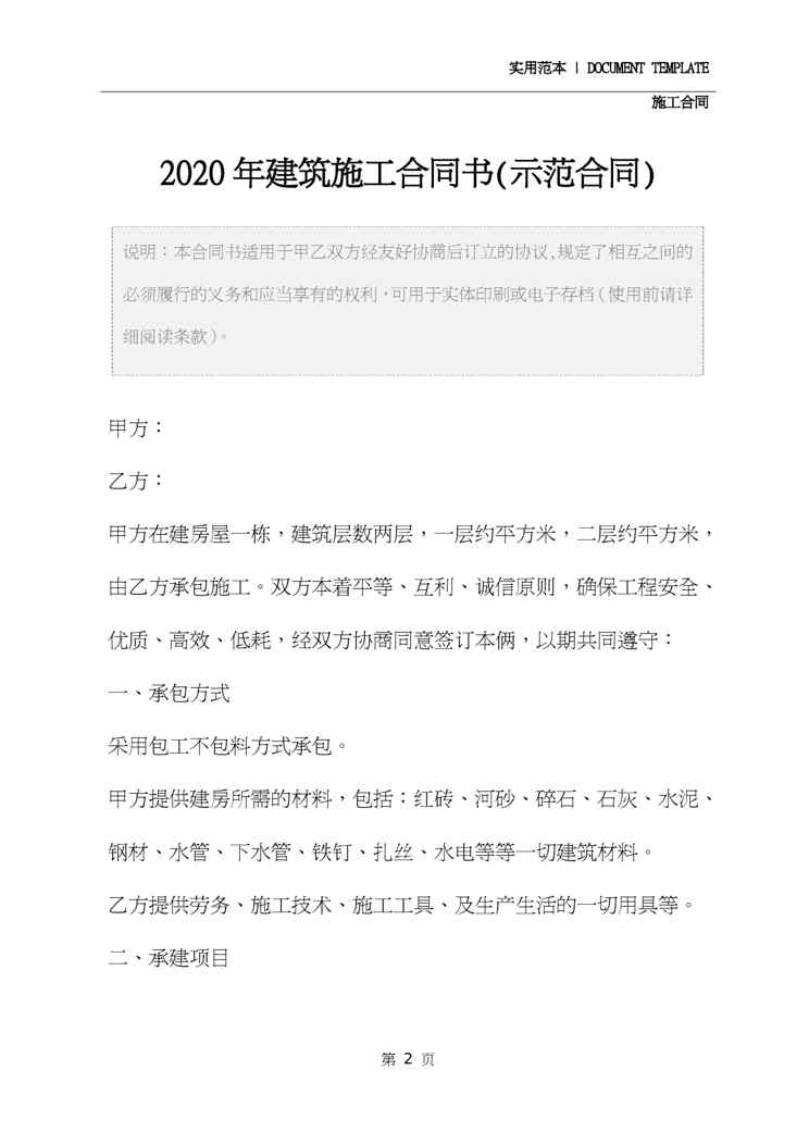 本站资深用户发布了最新的《2020年建筑施工合同书(示范合同)》文档,以下内容为预览,详细内容可下载阅读。