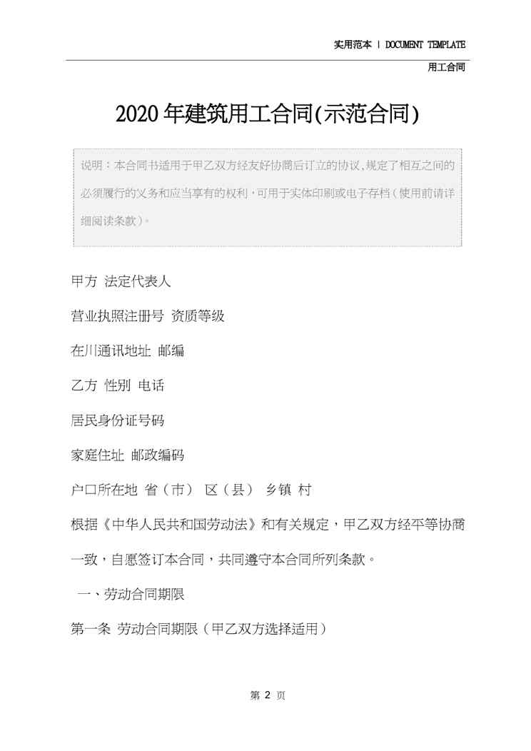不久前,最新文档《2020年建筑用工合同(示范合同)》全文正式在本站发布,感兴趣的用户可以下载阅读。 声明:本站所有文章,如无特殊说明或标注,均为本站原创发布。任何个人或组织,在未征得本站同意时,禁止复制、盗用、采集、发布本站内容到任何网站、书籍等各类媒体平台。如若本站内容侵犯了原著者的合法权益,可联系我们进行处理。