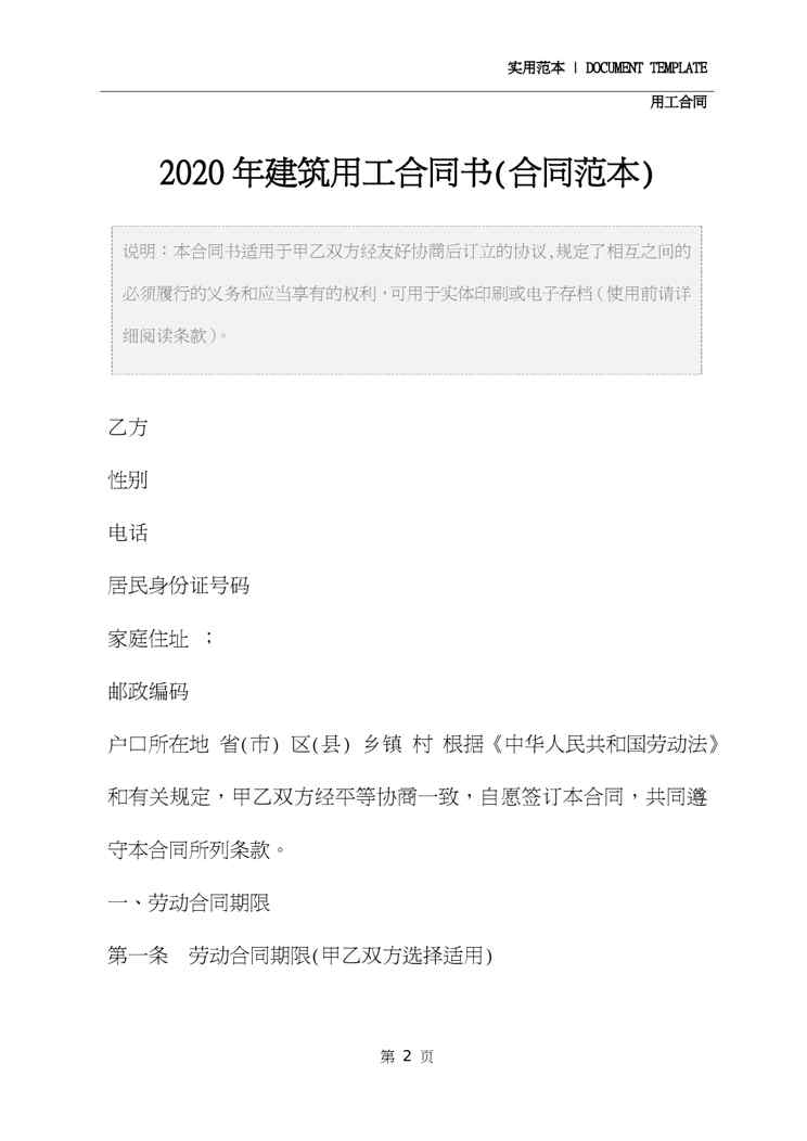 本站正式发布了《2020年建筑用工合同书(合同范本)》文档,文档详细内容可下载阅读。 声明:本站所有文章,如无特殊说明或标注,均为本站原创发布。任何个人或组织,在未征得本站同意时,禁止复制、盗用、采集、发布本站内容到任何网站、书籍等各类媒体平台。如若本站内容侵犯了原著者的合法权益,可联系我们进行处理。
