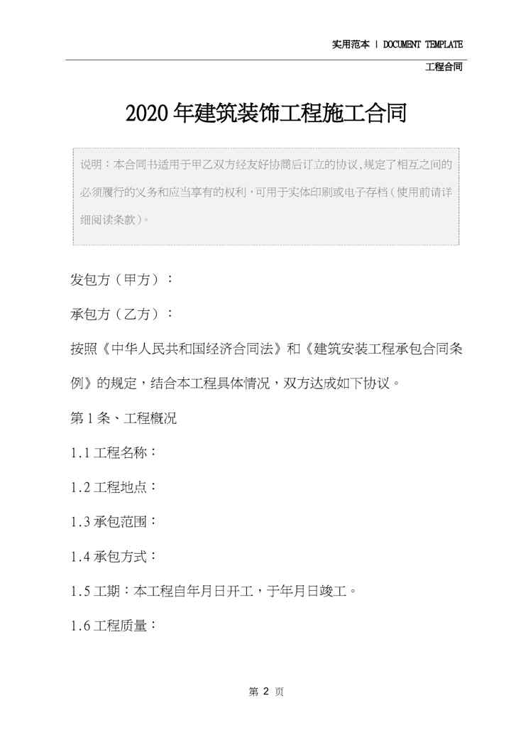 不久前,最新文档《2020年建筑装饰工程施工合同》全文正式在本站发布,感兴趣的用户可以下载阅读。 声明:本站所有文章,如无特殊说明或标注,均为本站原创发布。任何个人或组织,在未征得本站同意时,禁止复制、盗用、采集、发布本站内容到任何网站、书籍等各类媒体平台。如若本站内容侵犯了原著者的合法权益,可联系我们进行处理。