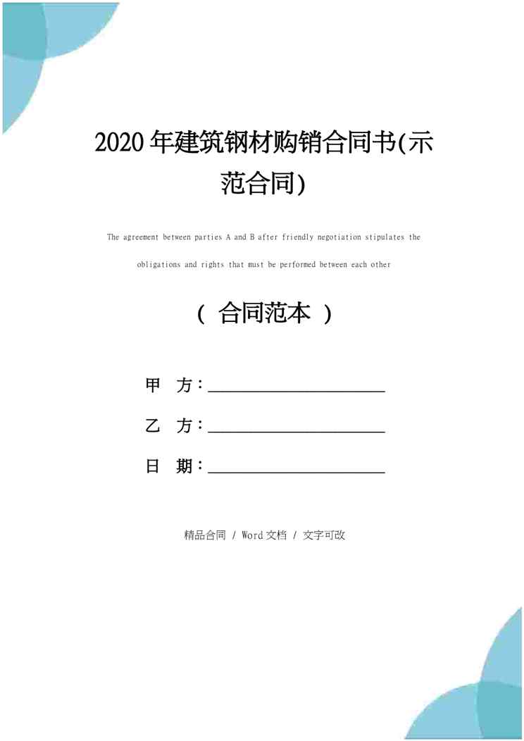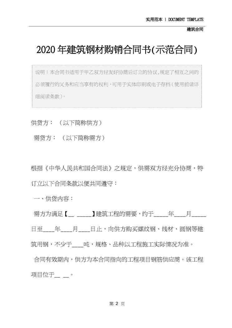 本站资深用户发布了最新的《2020年建筑钢材购销合同书(示范合同)》文档,以下内容为预览,详细内容可下载阅读。 声明:本站所有文章,如无特殊说明或标注,均为本站原创发布。任何个人或组织,在未征得本站同意时,禁止复制、盗用、采集、发布本站内容到任何网站、书籍等各类媒体平台。如若本站内容侵犯了原著者的合法权益,可联系我们进行处理。