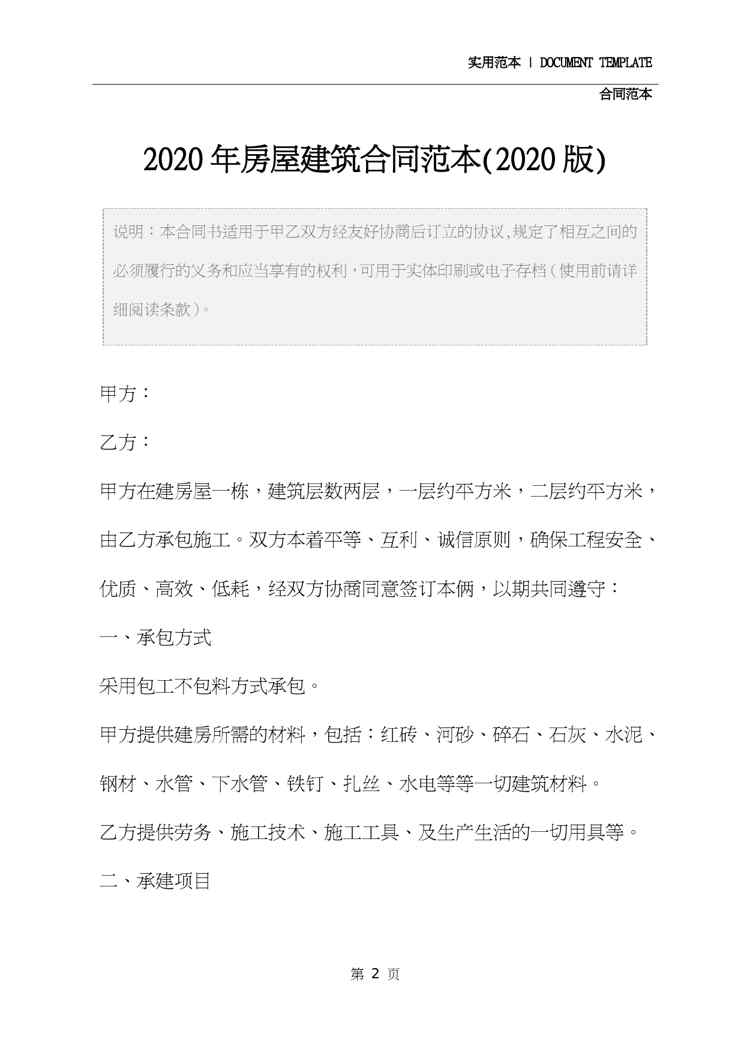不久前,最新文档《2020年房屋建筑合同范本(2020版)》全文正式在本站发布,感兴趣的用户可以下载阅读。 声明:本站所有文章,如无特殊说明或标注,均为本站原创发布。任何个人或组织,在未征得本站同意时,禁止复制、盗用、采集、发布本站内容到任何网站、书籍等各类媒体平台。如若本站内容侵犯了原著者的合法权益,可联系我们进行处理。