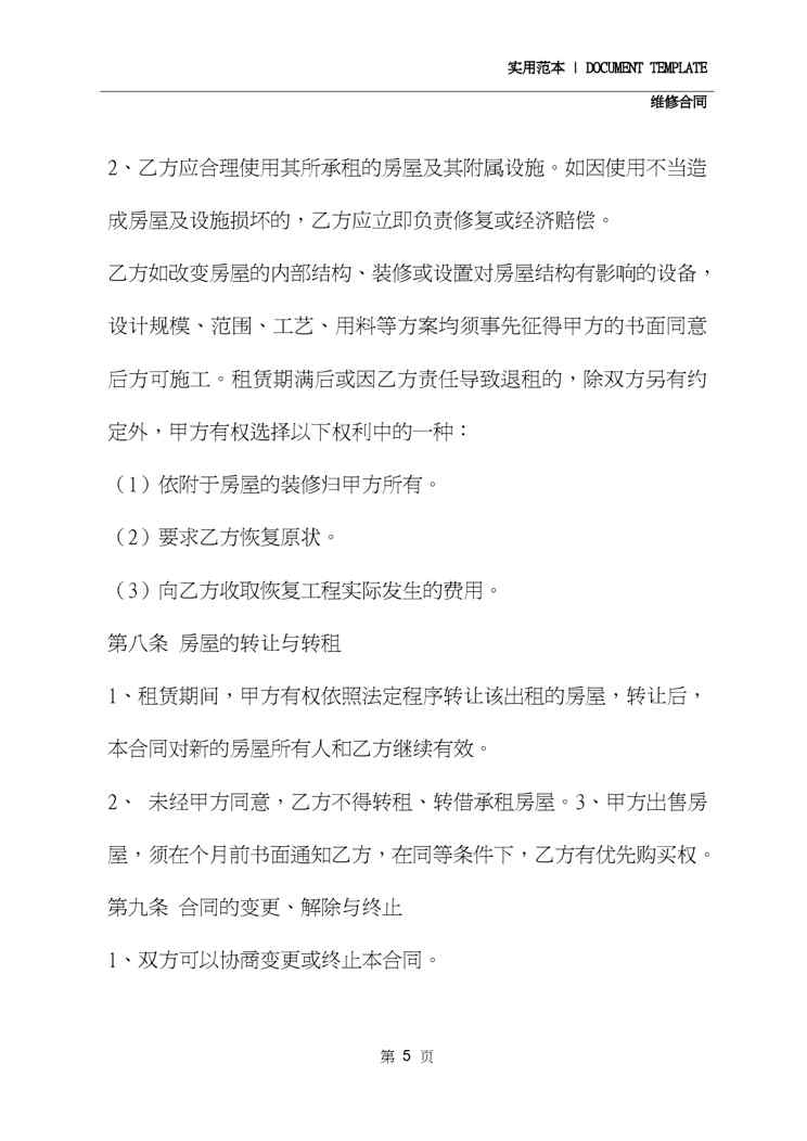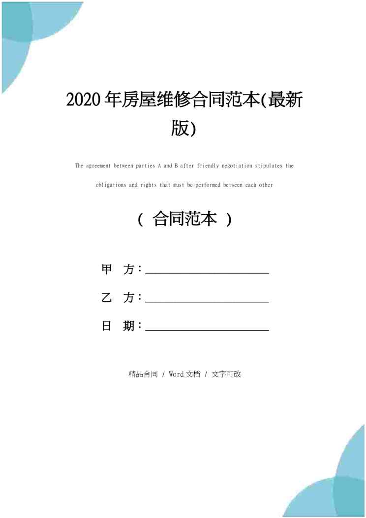 本站正式发布了《2020年房屋维修合同范本(最新版)》文档,文档详细内容可下载阅读。 声明:本站所有文章,如无特殊说明或标注,均为本站原创发布。任何个人或组织,在未征得本站同意时,禁止复制、盗用、采集、发布本站内容到任何网站、书籍等各类媒体平台。如若本站内容侵犯了原著者的合法权益,可联系我们进行处理。