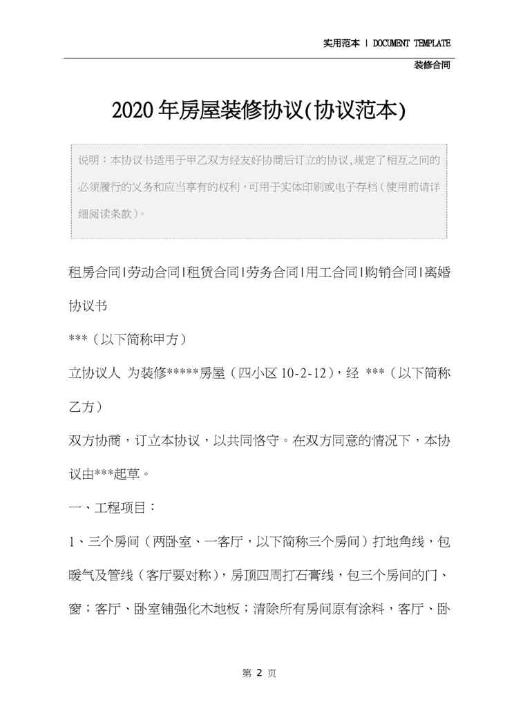 本站正式发布了《2020年房屋装修协议(协议范本)》文档,文档详细内容可下载阅读。 声明:本站所有文章,如无特殊说明或标注,均为本站原创发布。任何个人或组织,在未征得本站同意时,禁止复制、盗用、采集、发布本站内容到任何网站、书籍等各类媒体平台。如若本站内容侵犯了原著者的合法权益,可联系我们进行处理。