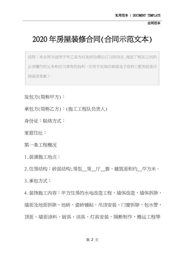 本站正式发布了《2020年房屋装修合同(合同示范文本)》文档,文档详细内容可下载阅读。 声明:本站所有文章,如无特殊说明或标注,均为本站原创发布。任何个人或组织,在未征得本站同意时,禁止复制、盗用、采集、发布本站内容到任何网站、书籍等各类媒体平台。如若本站内容侵犯了原著者的合法权益,可联系我们进行处理。