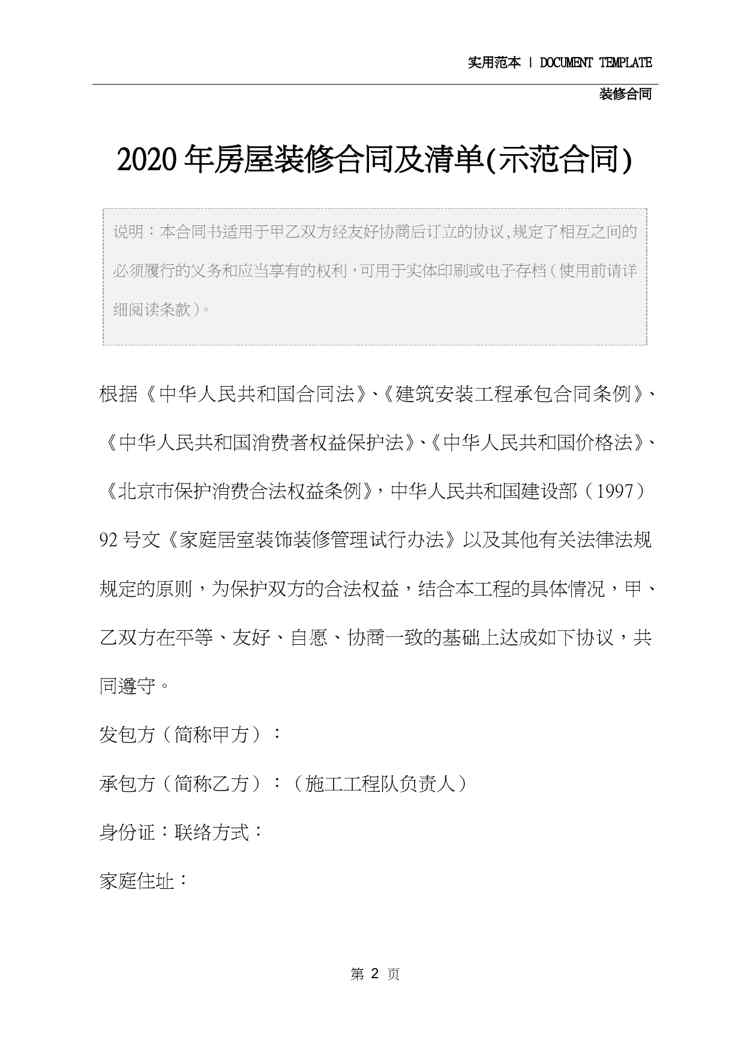 本站资深用户发布了最新的《2020年房屋装修合同及清单(示范合同)》文档,以下内容为预览,详细内容可下载阅读。 声明:本站所有文章,如无特殊说明或标注,均为本站原创发布。任何个人或组织,在未征得本站同意时,禁止复制、盗用、采集、发布本站内容到任何网站、书籍等各类媒体平台。如若本站内容侵犯了原著者的合法权益,可联系我们进行处理。
